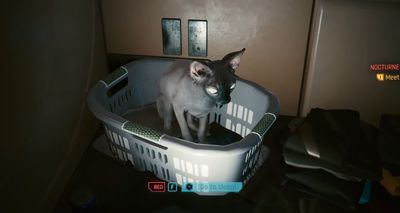 Po získání krmiva se vraťte do budovy V a dejte jídlo do misky. Chvilku počkejte, případně si zdřímněte a měli byste u misky najít kočku, z níž má obzvlášť Johnny Silverhand velkou radost. Kočku můžete vzít do náruče, bude vaším mazlíčkem a žít s vámi ve vašem bytě - pelech má v koši na prádlo.